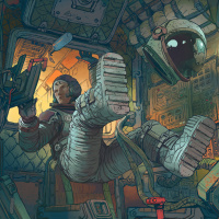 The image depicts an astronaut inside a spacecraft. The environment is filled with various pieces of equipment, suggesting that the scene takes place within a space shuttle or similar space-traveling vehicle. The art style appears to be illustrative and vibrant, with a focus on science fiction elements.