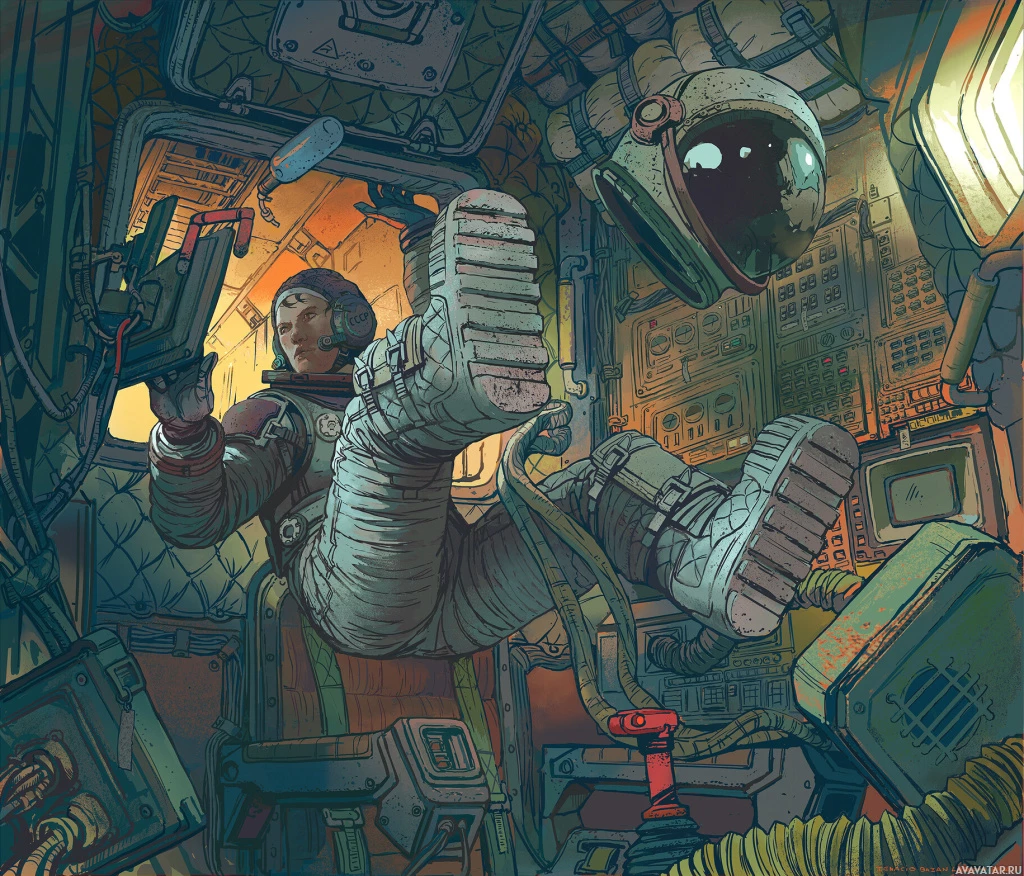 На картинке изображен астронавт внутри космического корабля. Окружающая среда заполнена различными элементами оборудования, что наводит на мысль о том, что действие происходит внутри космического челнока или аналогичного космического транспортного средства. Художественный стиль является наглядным и ярким, с акцентом на элементы научной фантастики.
