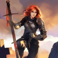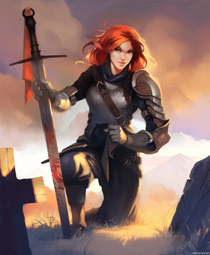 a female character with red hair. She is wearing armor and holding a sword, suggesting she may be a knight or warrior from