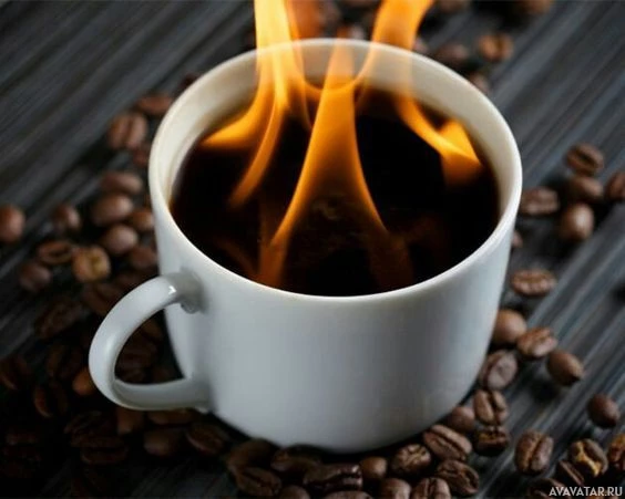 На картинке изображена чашка кофе с языками пламени, поднимающимися сверху, что указывает на то, что она горит. В кадре крупным планом изображена чашка и разбросанные вокруг нее кофейные зерна, которые, как известно, ассоциируются с кофе. На этом снимке запечатлена необычная и потенциально опасная ситуация, связанная с пожаром.