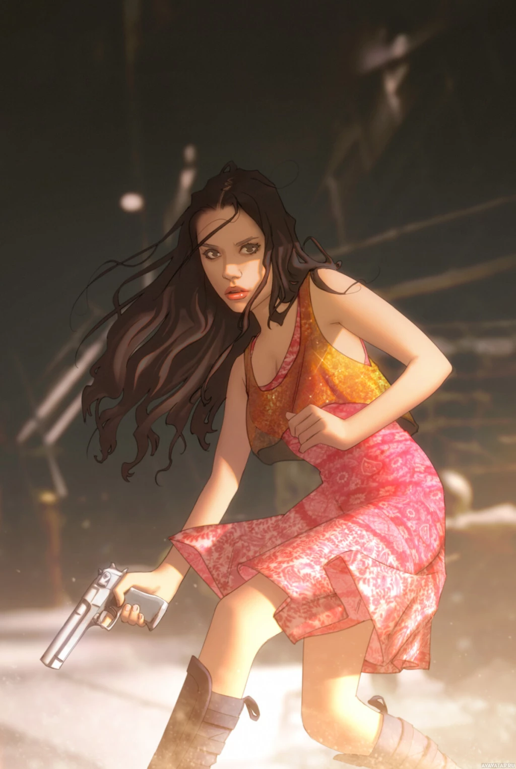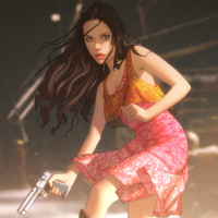 dark hair and is wearing a sleeveless, patterned dress that could be described as a tank top or halter neck style. In her right hand, she holds what looks like a pistol, which suggests she might be involved in some