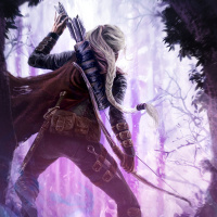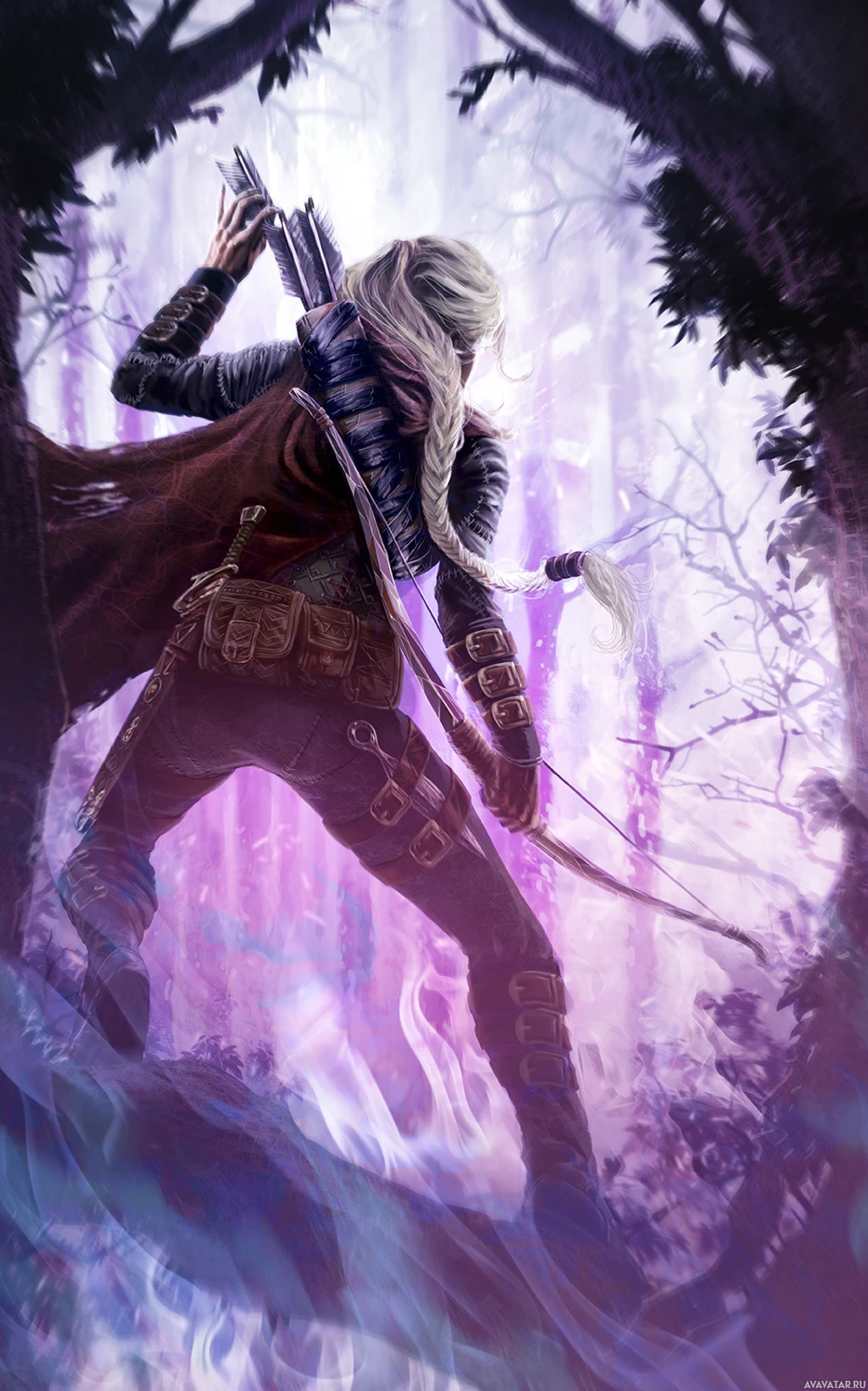 white hair. She is standing behind a tree, holding a bow and preparing to shoot an arrow. Her attire suggests that she might be in a fantasy or