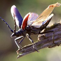 The image shows a beetle. It is sitting on what appears to be a tree branch, likely in a natural outdoor setting. The beetle has distinct coloration with red and black markings on its body.