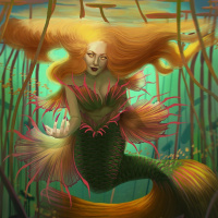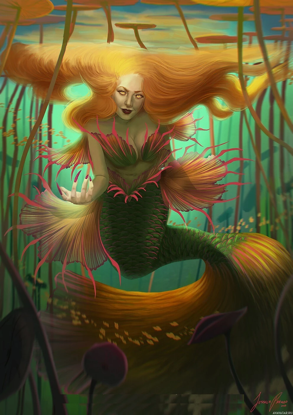 a fantasy scene featuring a mermaid. The mermaid has long, flowing hair and is adorned with scales on her body, giving the appearance of being a fish-human hybrid. She's situated among water plants, suggesting