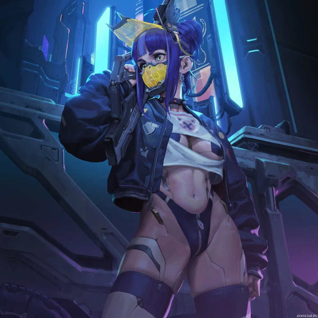 a confident pose. Her attire includes a jacket over her bare torso and thigh-high black boots with straps, suggesting a high-
