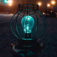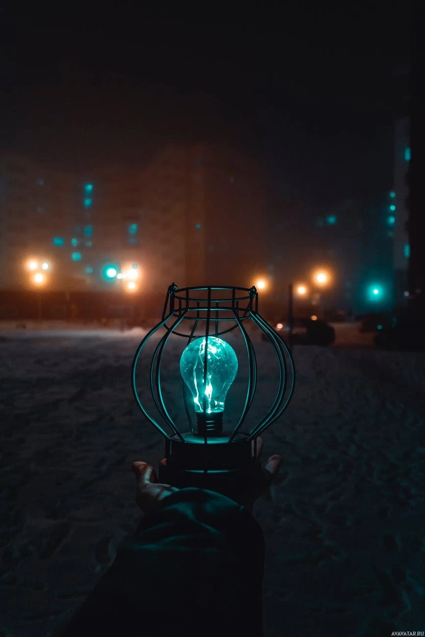 На картинке изображена рука, держащая зажженный стеклянный фонарь на фоне ночного неба. Фонарь подсвечен, создавая теплое свечение, контрастирующее с темным фоном. Свет от фонаря создает фокусную точку в кадре и отбрасывает мягкое свечение на окружающую обстановку. Кроме того, ночью на фоне того, что кажется городской средой, виден размытый фон.
