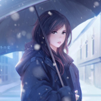 an open umbrella over her head, suggesting that it might be raining or snowing. She has long