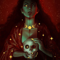 dark hair, wearing what appears to be a red robe or garment. She is holding an open skull in one hand and has