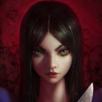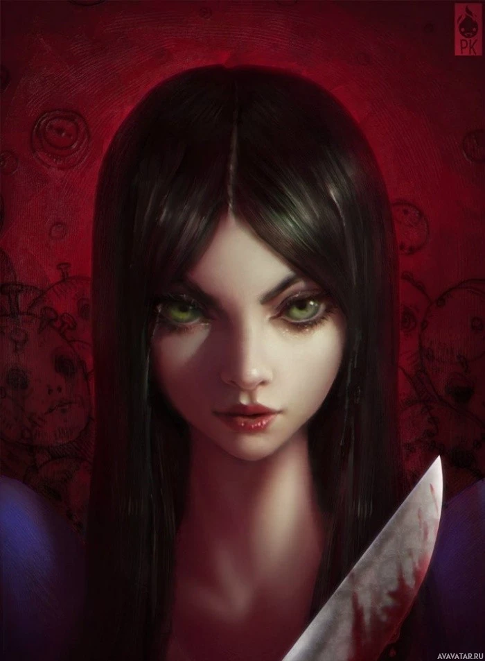 green eyes and is holding what looks like a sword or a similar weapon. The background has a dark, gothic or horror theme, enhancing