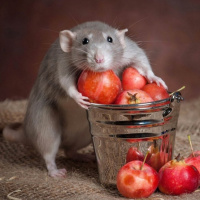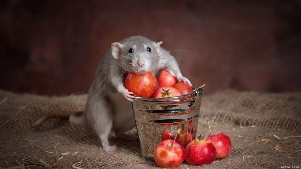 На картинке изображена крыса (или мышь, если вам так больше нравится), стоящая на чем-то похожем на стол, накрытый сеткой. Перед крысой находится прозрачный стеклянный контейнер с несколькими красными яблоками. Задний план не очень хорошо виден из-за того, что объект съемки занимает большую часть кадра.