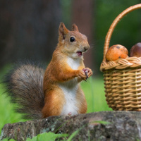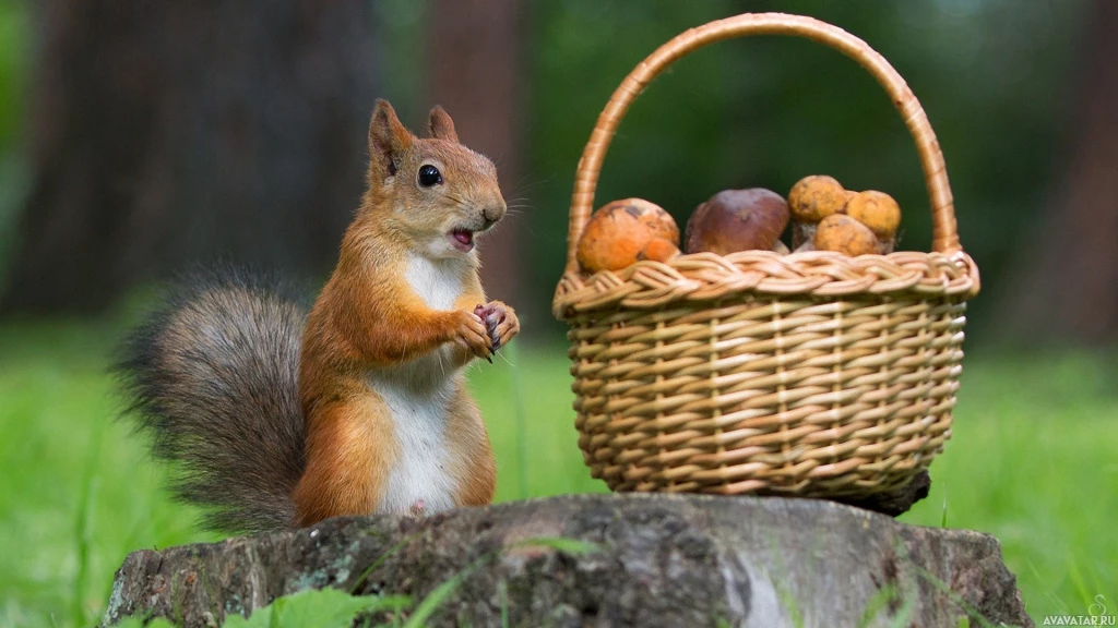 На картинке изображена белка, стоящая рядом с корзиной, наполненной орехами. Кажется, что она находится на природе, возможно, рядом с лесом или парком. Белка смотрит прямо в камеру, придавая своему лицу любопытное и внимательное выражение.