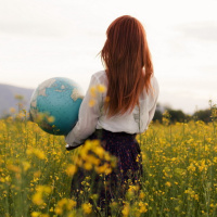 black pants, and is holding an object that looks like a small globe or ball. The photo seems to capture a moment of contemplation or daydreaming as the person gazes into the distance with