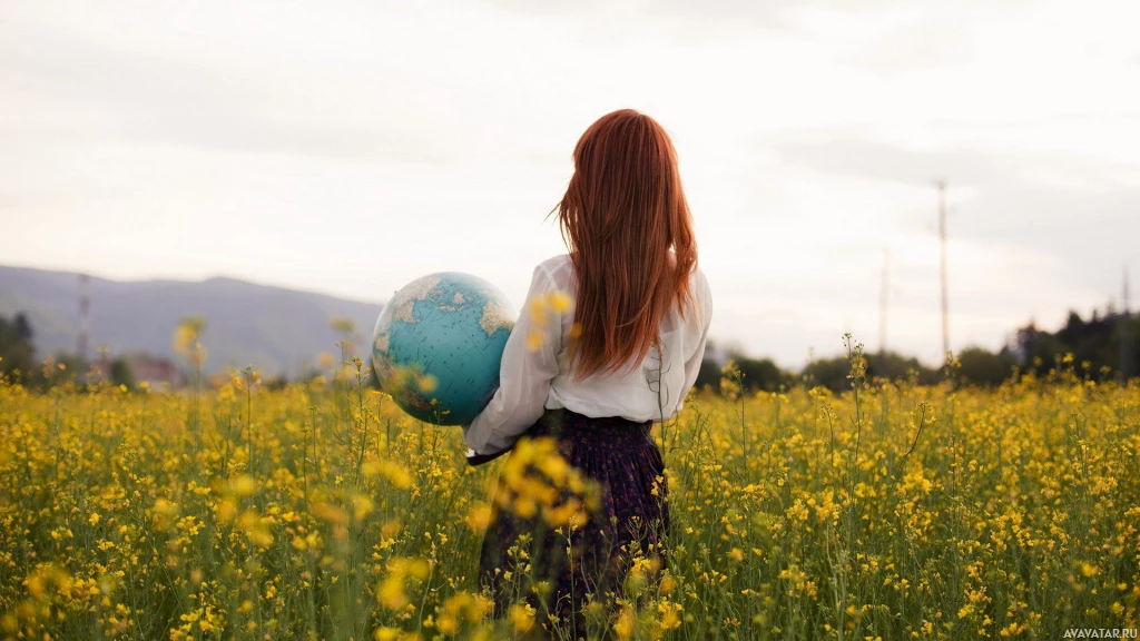 red hair standing in a field of yellow flowers, looking out towards the horizon. The individual appears to be wearing a white blouse and