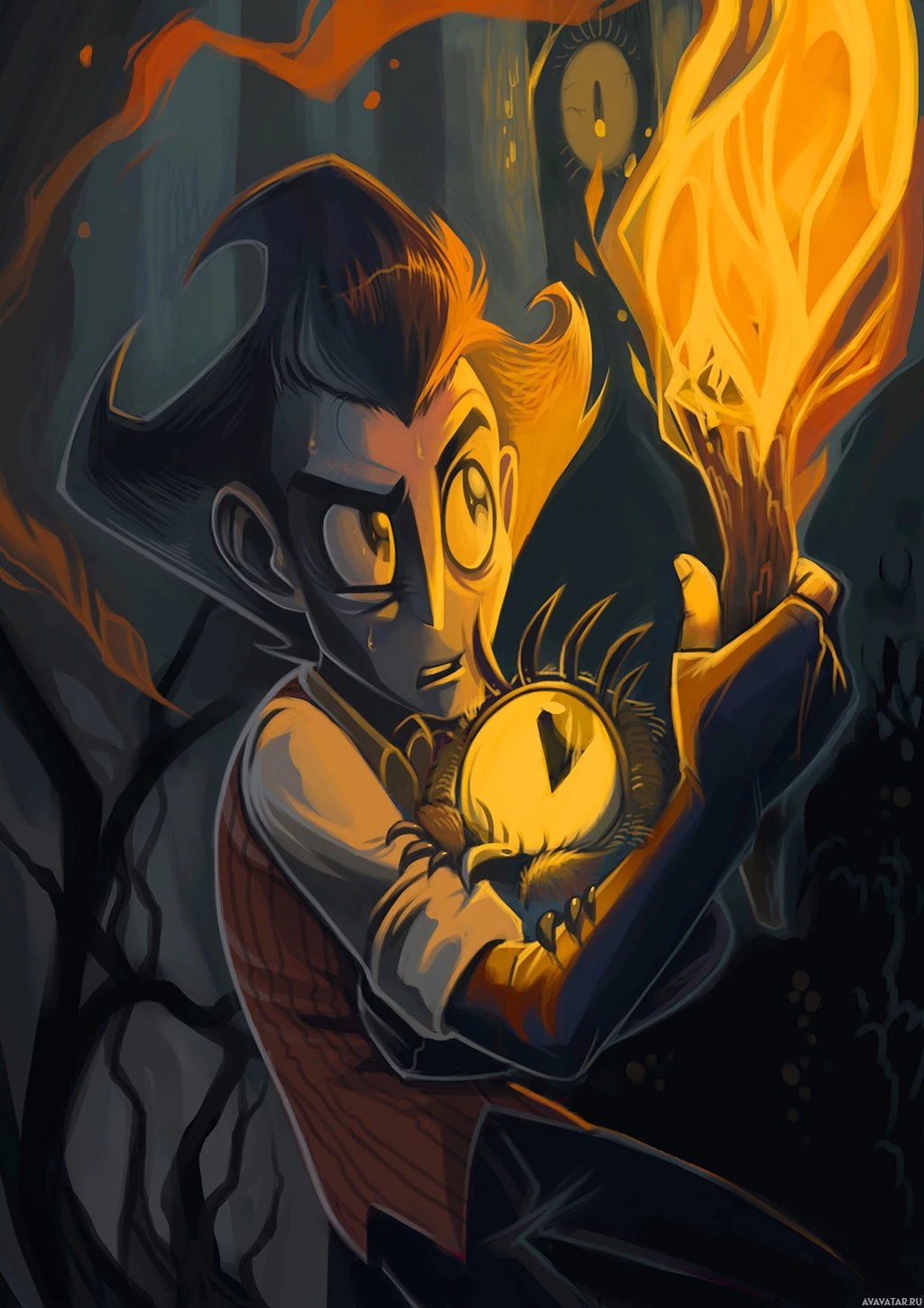 an animated character, a young man with spiky hair and an expressive face. He's wearing a vest over a shirt and seems to be in a slightly distressed or surprised state. In one hand, he holds a torch aloft, which is set ablaze at the top. His other arm is wrapped around what appears to be an object resembling