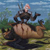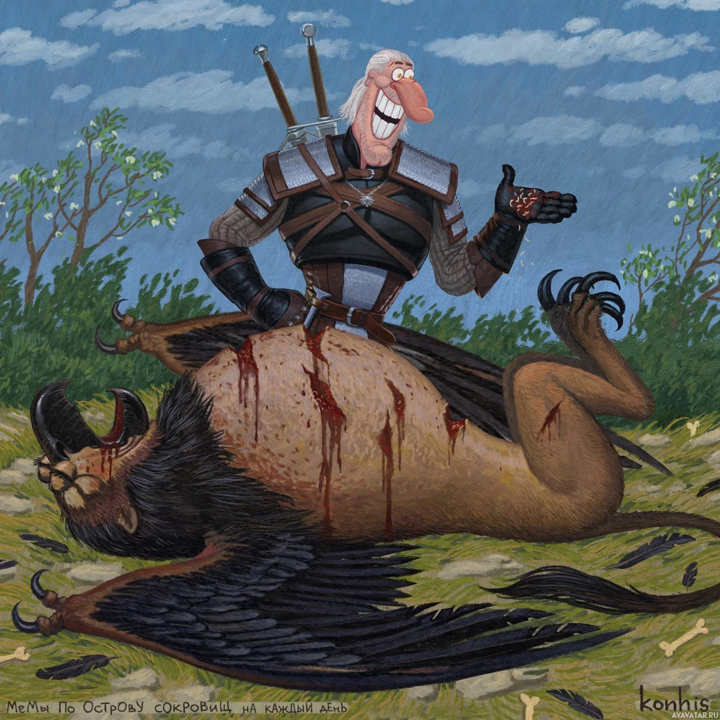 the video game "The Witcher 3: Wild Hunt" featuring the character Geralt of Rivia. He is shown riding atop a griffon, which appears to be