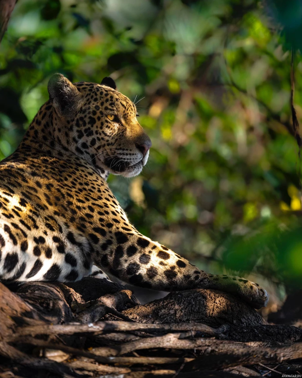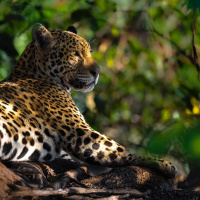 a tree branch in what appears to be a dense, tropical forest. The sunlight filtering through the leaves creates a warm and serene atmosphere around the animal. The leopard's gaze is directed towards something off-camera, suggesting that it might be attentive to its surroundings or focusing on