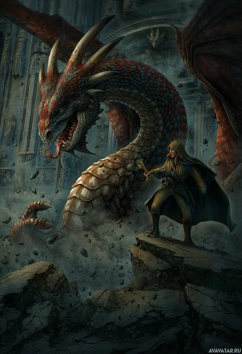 sharp teeth, and large wings spread wide as if ready to strike. The background suggests a ruined or ancient setting with collapsed structures that contribute to the overall
