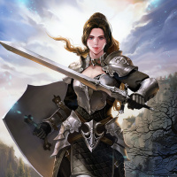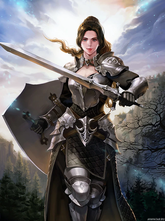 female warrior. She is wearing armor and holding a sword, suggesting she might be a character from a role-playing game or