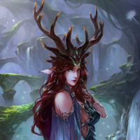 red hair and is adorned with what appears to be deer antlers on her head, which gives the impression of a fantastical creature or elf-like being. She's wearing a dress that seems to be made out of leaves and flowers, suggesting she may have