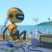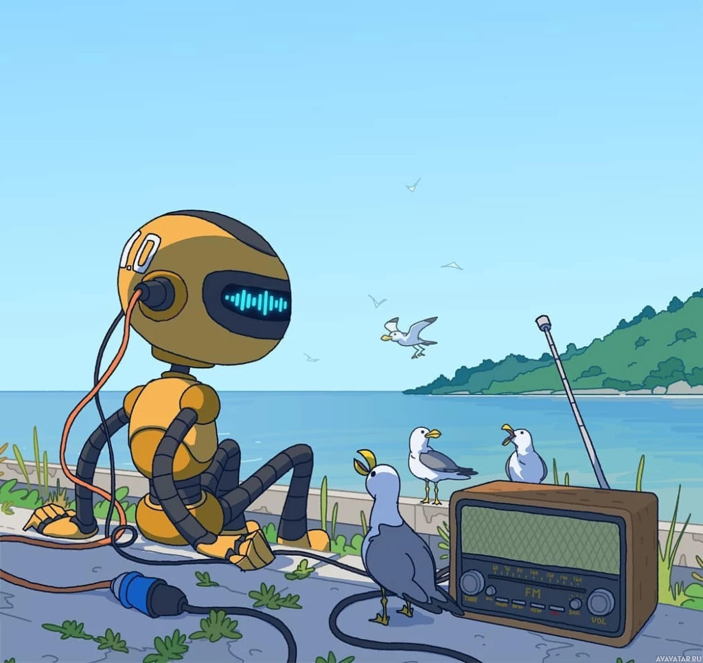 На картинке изображен анимированный робот, сидящий на пляже в окружении птиц. У робота желтое тело с различными механическими деталями, и он носит наушники. Кажется, что он слушает музыку из портативного радиоприемника, который стоит на земле рядом с ним. На заднем плане также видны летающие чайки и спокойная океанская вода под ясным небом.