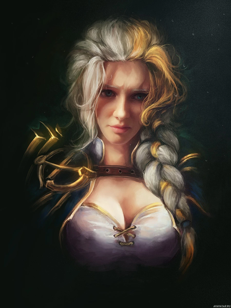a female character with blonde hair, wearing armor and a helmet. She has a serious expression on her face and the armor appears to be ornate, suggesting she may be from