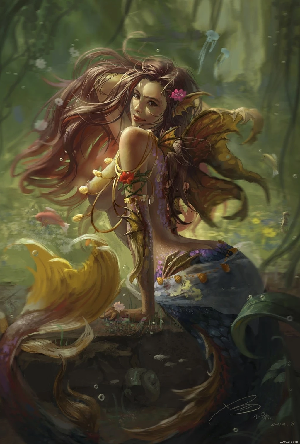 The image depicts a fantasy-themed illustration of a mermaid. The mermaid has long, flowing hair and is seated among lush