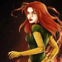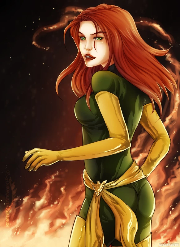 На картинке изображена женщина, одетая в костюм, напоминающий униформу одного из персонажей Людей Икс, в частности Джин Грей. Она показана сзади с динамической позой, которая предполагает, что она может быть в движении или реагировать на событие. На заднем плане изображено то, что кажется пламенем или энергетическими эффектами, что усиливает драматическую природу сцены.