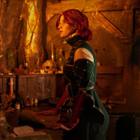 red hair and a medieval-style outfit that includes armor and a dress with sleeves that appear to be designed for protection rather than fashion. The setting looks like a room with an old-fashioned look, possibly serving as a workshop or lab, with various