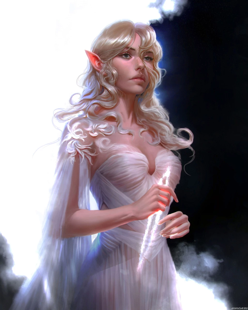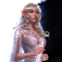 celestial energy emanating from her hand, suggesting she may have powers related to magic or enchantment. The background is dark, which contrasts with the lighter colors of the elf's attire and features, creating