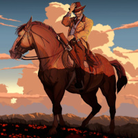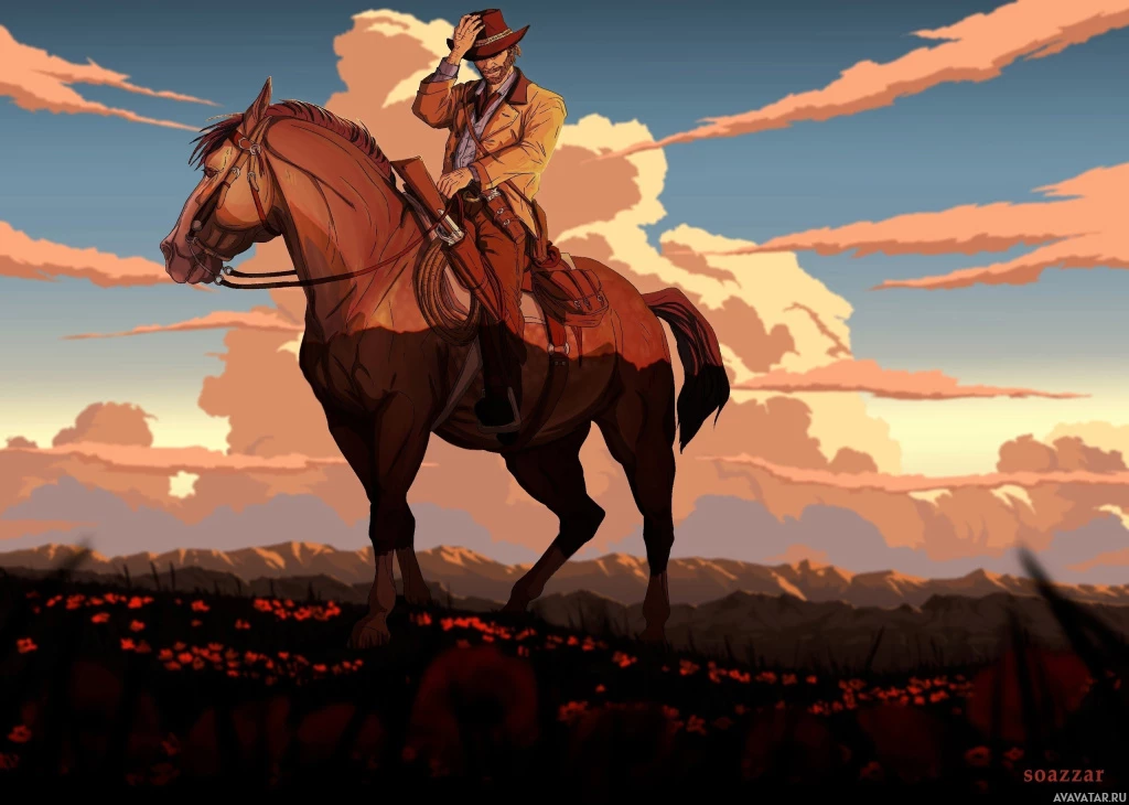 На картинке изображен мужчина в традиционной одежде ковбоя верхом на лошади. На нем шляпа, и кажется, что он смотрит куда-то за пределы кадра. Фон представляет собой пейзаж с облаками и цветовым градиентом, который может указывать как на восход, так и на закат солнца, что придает сцене драматический эффект.