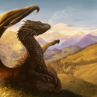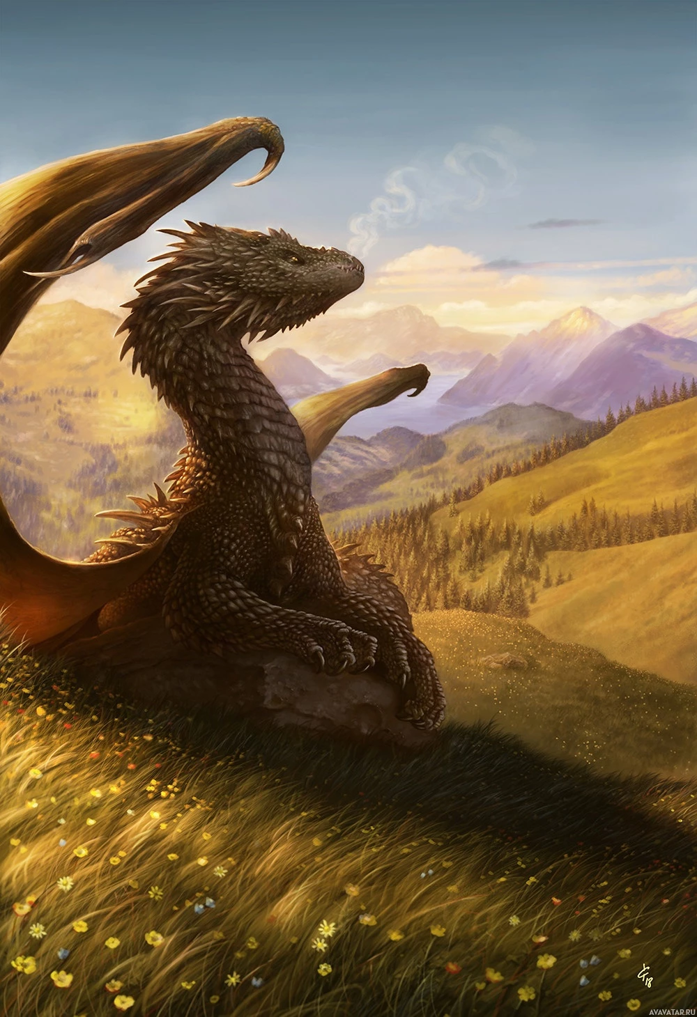 a fantasy scene featuring a dragon. The dragon is sitting upright on its