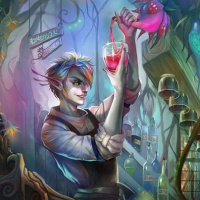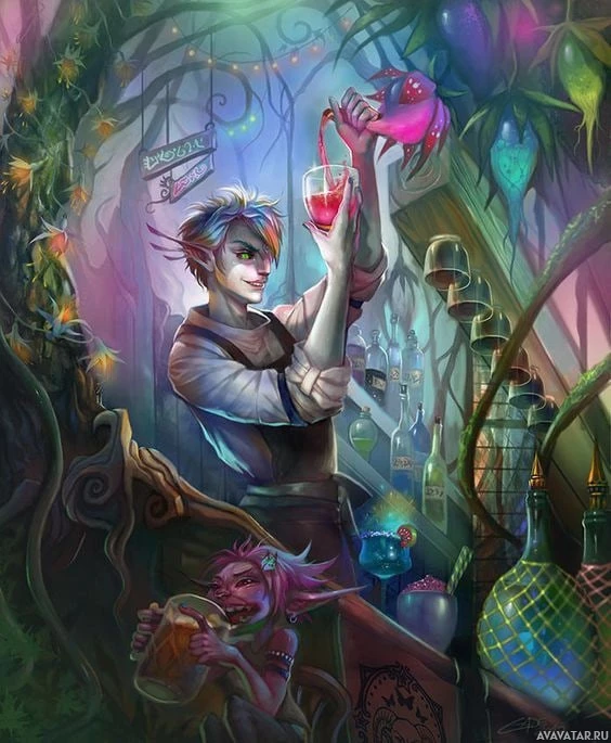 The image shows a fantasy-themed scene with a character who appears to be an alchemist or bartender. They are holding out a drink, possibly concocting a potion or brewing a special beverage. In the background, there is a chaotic jungle-like setting filled with