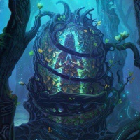 forest scene. There is a large, intricate tree structure that resembles a dragon's head with multiple horn-like protrusions and a detailed