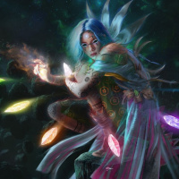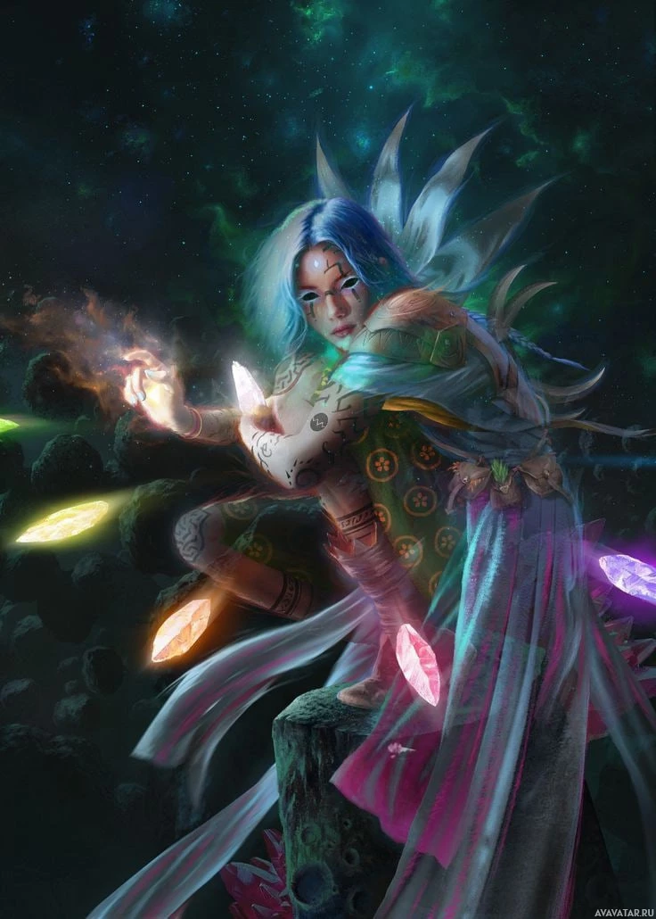 the mystical atmosphere created by the character's attire and the magical items around them.