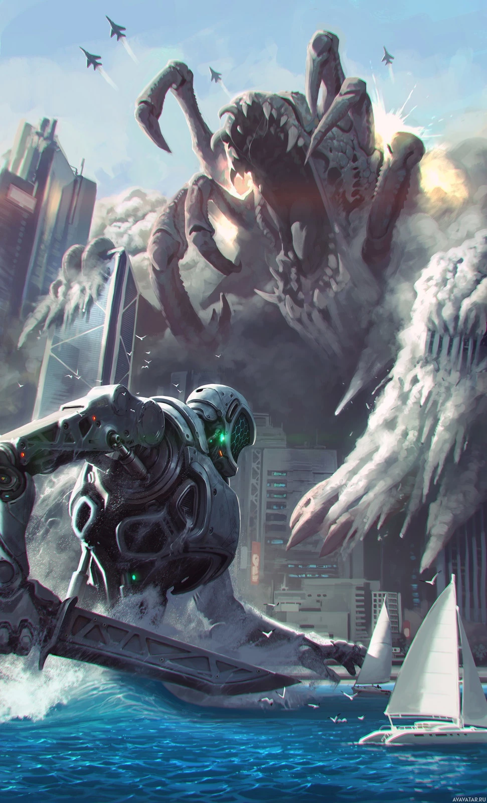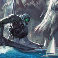 packed scene with a sense of chaos and urgency. To the right, there is a massive sea creature, possibly an octopus, that has been mutated or enhanced to a gigantic size, indicating advanced biotechnology or genetic engineering in this science fiction setting. The creature is attacking buildings in the city with its tentacles raised and mouth open, adding to the sense of danger and destruction. Overall, the image conveys a high-energy science fiction narrative involving robots, sea creatures, and urban settings under threat from these mutated or enhanced entities.