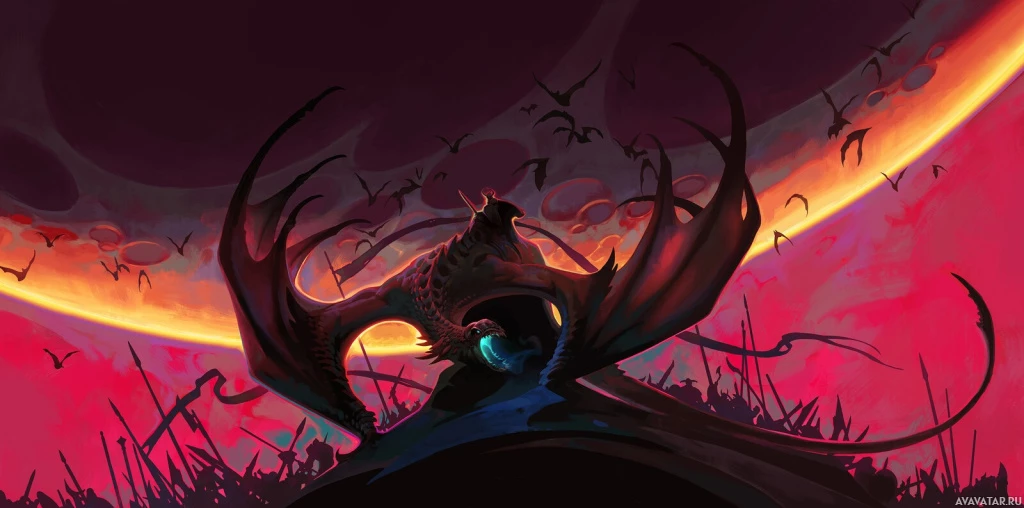 several birds and a person, likely human, given their size relative to the dragon. The background is fiery and dark, suggesting a volcanic eruption or some other intense natural event, which adds