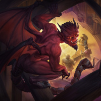 red skin and horns, which are typical characteristics of demons in fantasy artwork. The background suggests a forest or