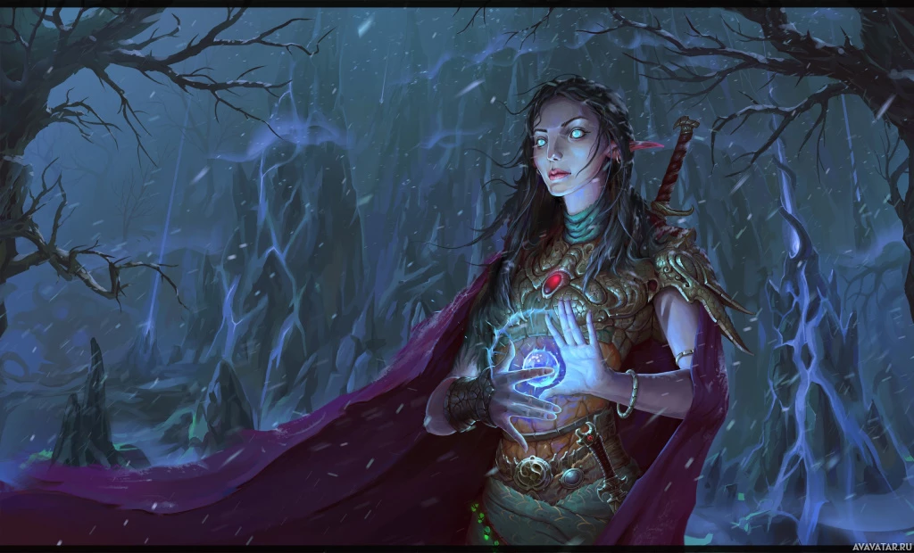 magical abilities. The overall atmosphere of the image is eerie and mystical, fitting for a fantasy or horror