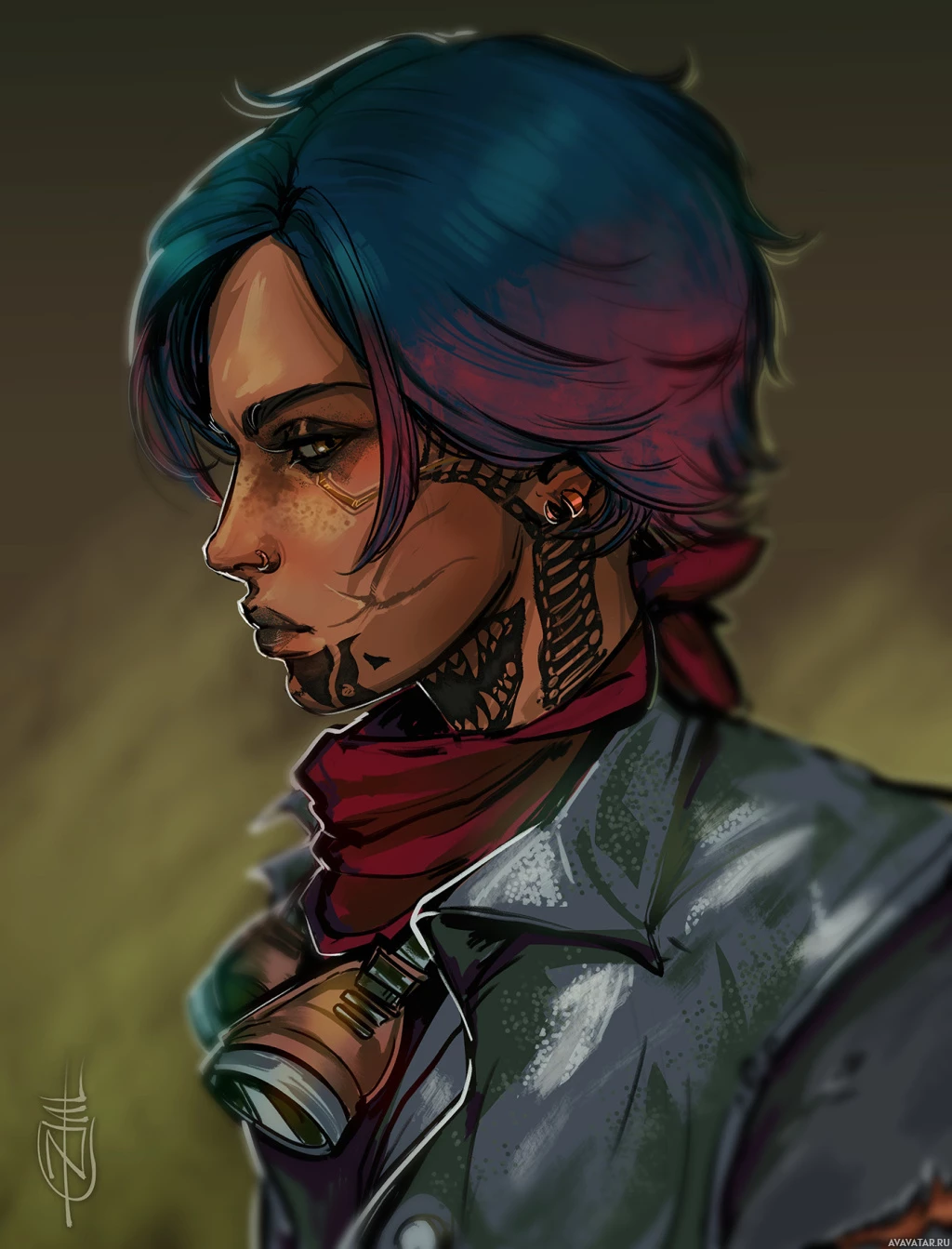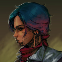 a young girl or teenager with distinctive features such as blue hair and tattoos. She's wearing what seems to be a uniform or a jacket that has patches on it, suggesting she might have a role in some form of organization or group. Her expression is contemplative or focused, looking straight ahead. The art style is reminiscent of anime and manga drawings, with