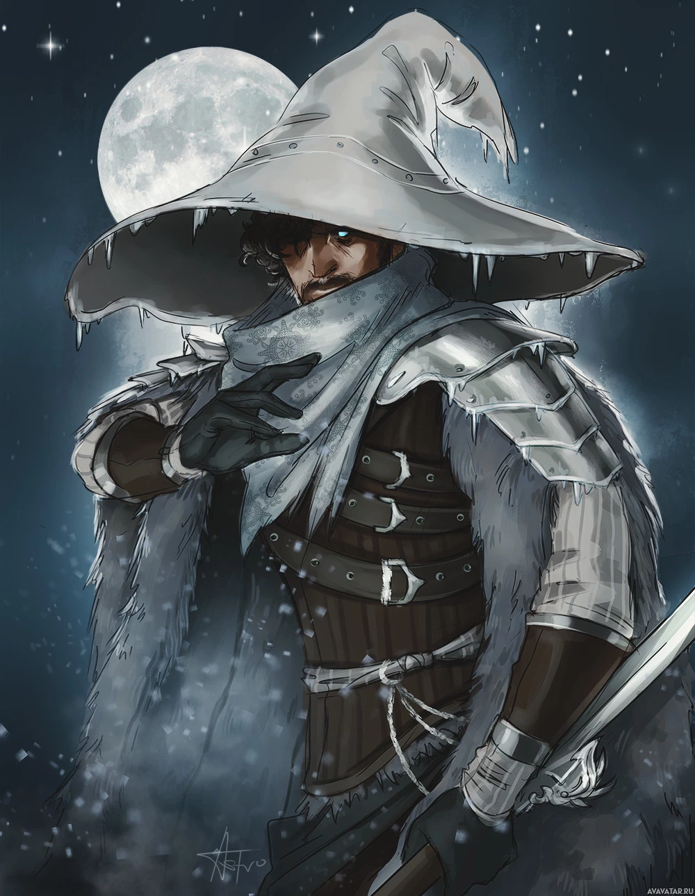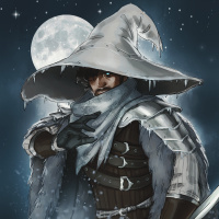 The image depicts a character who appears to be from a fantasy or role-playing game. This individual is wearing a witch hat, which is often associated with characters who have