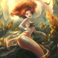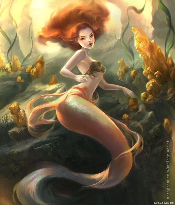 red hair and is wearing a tail, which is typical for mermaid imagery in fantasy settings. Her attire includes elements that resemble scales or