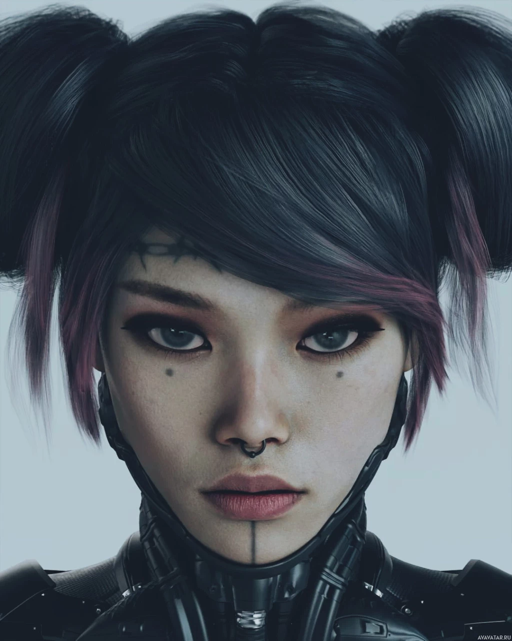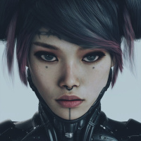 a young woman, who has dark hair and is wearing what appears to be futuristic or cyberpunk-style gear. She has dark eyebrows and eyes, and her makeup includes