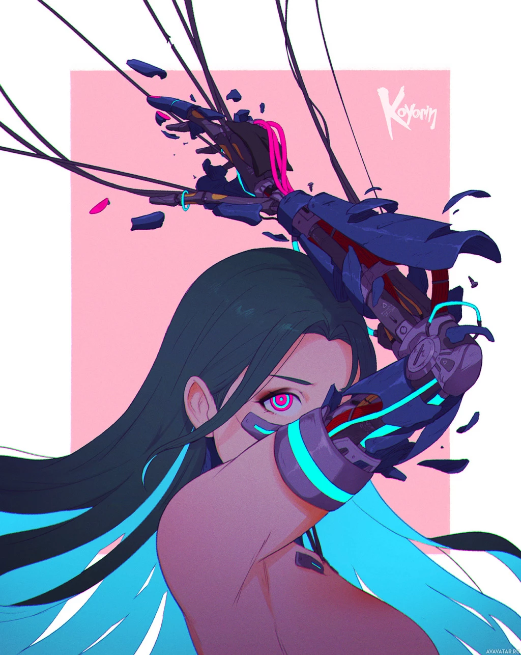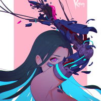 splashes of color, mainly pink and blue hues, giving the scene an energetic yet somewhat chaotic atmosphere. There's also what seems to be mechanical debris or shards scattered around her head, possibly indicating