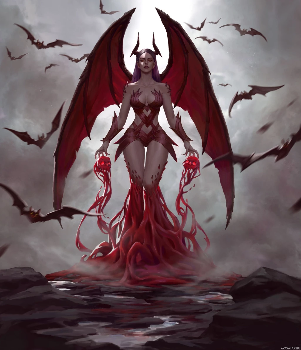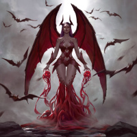 The image depicts a fantasy-themed illustration of a character that appears to be a succubus. The character is shown with red wings and horns, typically associated with demons or