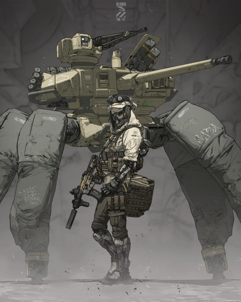 mechanized suit with tank-like features such as tracks and artillery barrels. The background suggests a post-apocalyptic or battle-damaged environment. There are also symbols that might represent logos, possibly related to the setting's narrative.