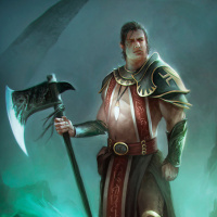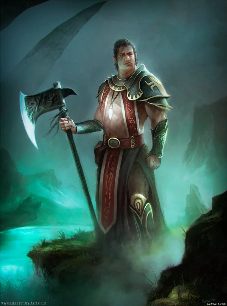 The image depicts a man in a fantasy-style armor and holding an axe. He appears to be standing in