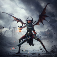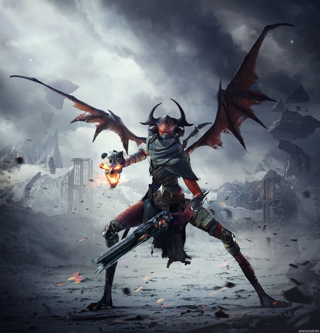 The image shows a fantasy-themed character who appears to be an archer. This character has distinctive features such as wings, horns, and what seems like a demonic or dark entity appearance. They are holding a bow in one hand and a staff in the other. The setting is chaotic with explosions and rubble around, suggesting a battlefield or