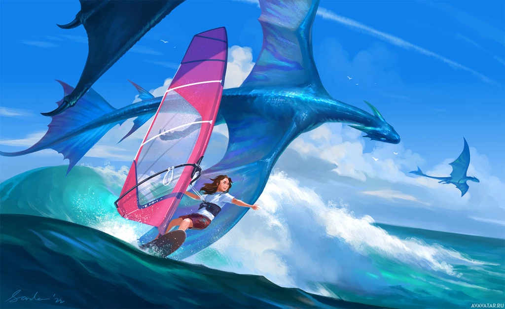 the presence of dragons, which are often associated with fantasy or mythical elements. The dragons appear to be helping her ride the waves or flying alongside her, adding an element of magic or adventure to the image.