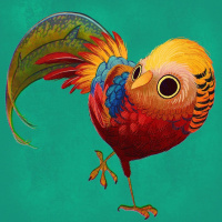 a colorful bird with vibrant plumage. It appears to be inspired by a parrot, given its large eye, curved beak, and