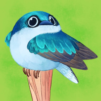 round eyes that give it a surprised or wide-eyed expression. It has a blue body with some brown details on its wings and